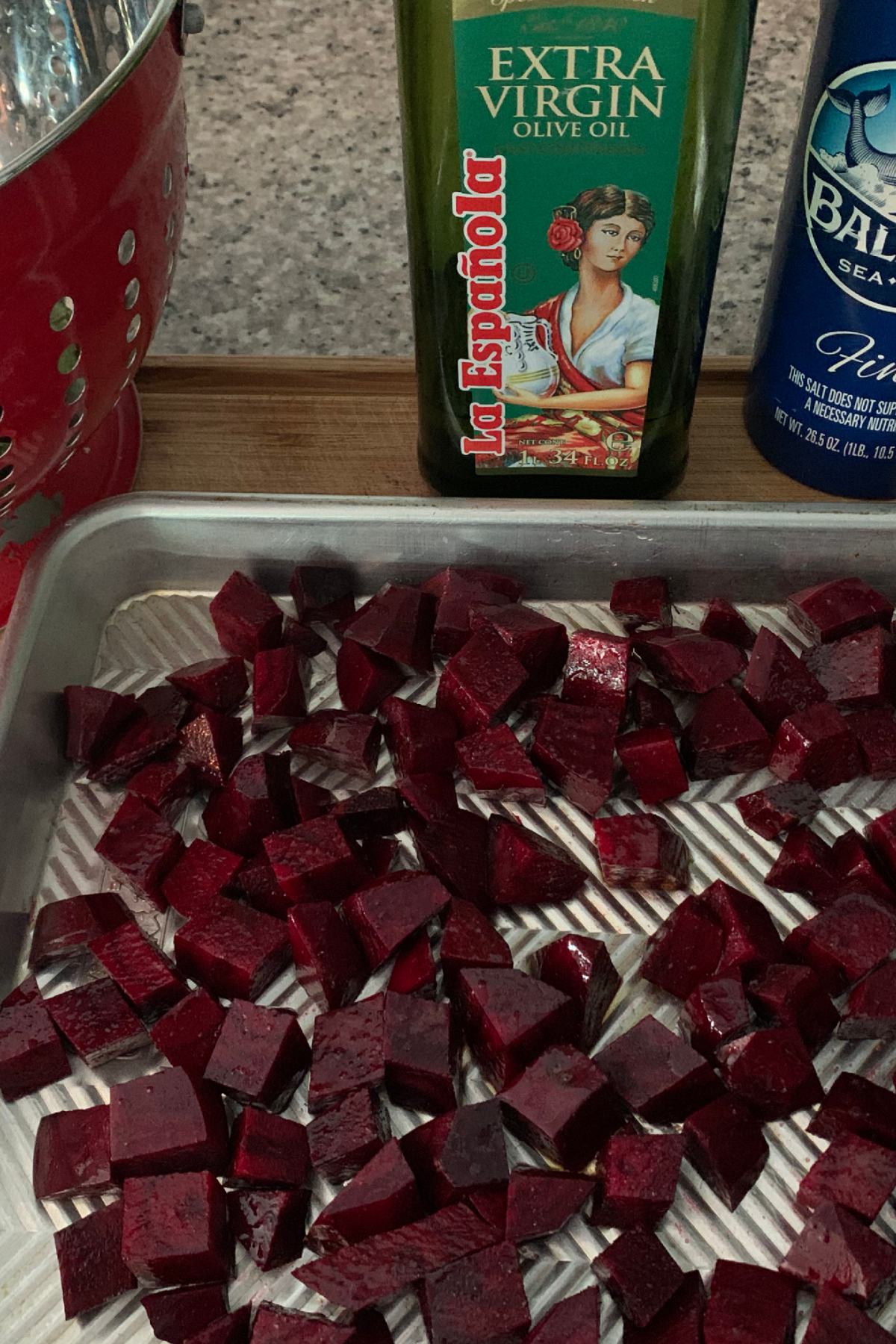 Roasted beets should be done in advance - peel and chop into 1/2" pieces. Coat with olive oil, salt, and pepper and roast for 20 minutes, 425 degrees, on a cooking pan. Stir, check for doneness, and maybe cook another 10 minutes or so. Taste them and make sure they are NOT crunchy. They should practically melt in your mouth. I'm pretty sure undercooked beets are why many people think they hate beets.